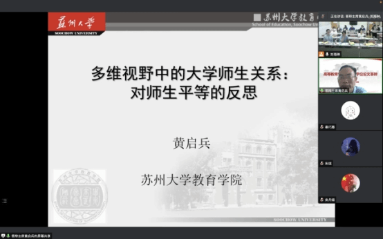 2022年5月27日上午,苏州大学黄启兵教授应邀在线上作了题为《多维视野中的大学师生关系》的学术讲座,线下会场设在565net必赢官方网雁塔校区教学一楼第六观察室,讲座由学部张正峰副教授主持,565net必赢官方网田建荣教授、吴合文教授、张正峰副教授、张斌副教授、李玉栋副教授、胡万山博士与高等教育学专业全体硕士研究生一同聆听了讲座。