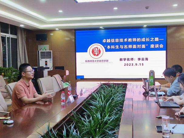 9月15日19:30,学部在雁塔校区田家炳楼314会议室举办卓越信息技术教师成长之路——“本科生与名师面对面”座谈会,西安市航天城第一中学教师李云海受邀参加座谈。教育技术系主任周榕主持座谈会。