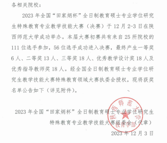 关于2023年全国“田家炳杯”全日制教育硕士专业学位研究生特殊教育专业教学技能大赛(决赛)获奖名单的公告